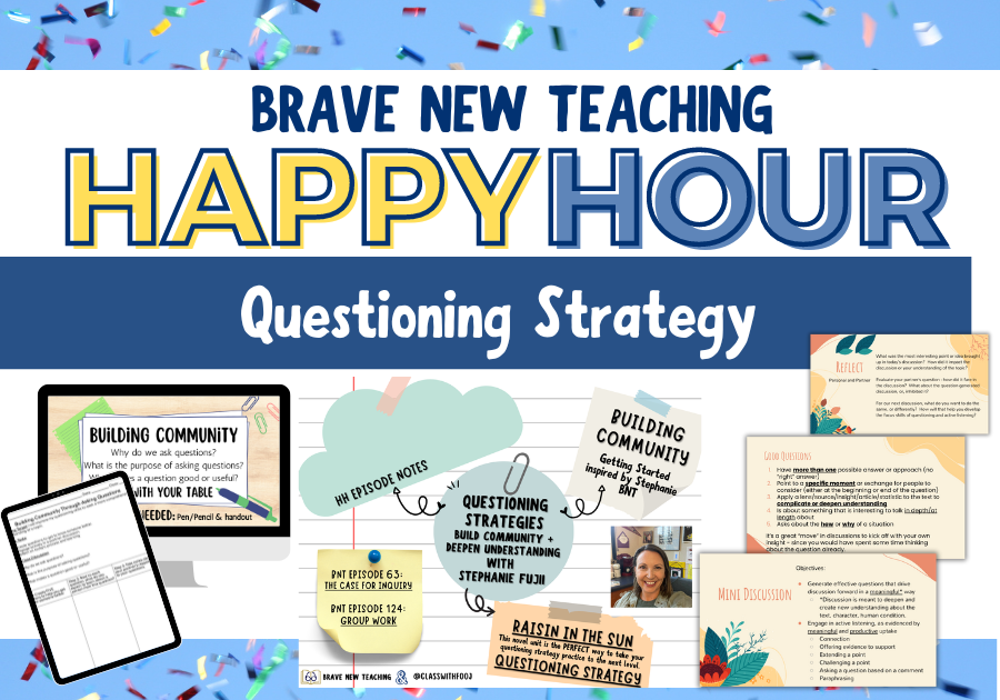 In Happy Hour Episode 88, Stephanie Fujii shares her strategy for fostering a collaborative classroom and guiding deeper student inquiry in A Raisin in the Sun. This resource offers two lessons: first, build classroom community by teaching students to evaluate and clarify questions. Then, use Stephanie’s novel unit as a model with prompts and strategies to explore complex themes. These resources will transform how students connect with the text—and each other!