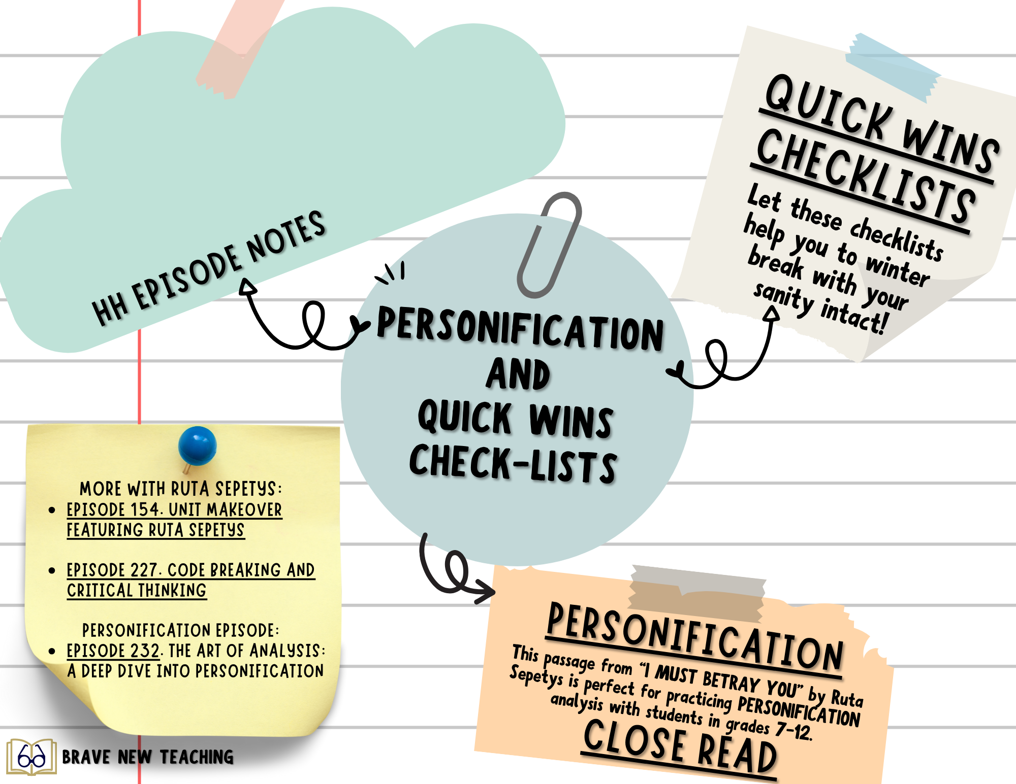 Boost engagement and streamline end-of-semester prep with this resource! Featuring a Close Read using a passage from I Must Betray You by Ruta Sepetys, students will explore personification. Paired with a Quick Tips Checklist, it offers strategies to help teachers stay organized and reduce stress before winter break.